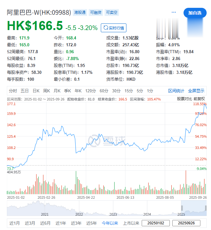 阿里巴巴(09988.HK)港股股价,今年以来累计上涨105.46%。