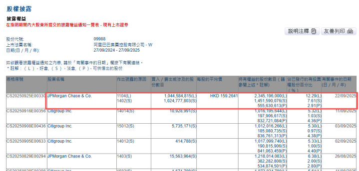 摩根大通周五(9月26日)申报其在阿里巴巴(09988.HK)的持股,好仓权益在周四(9月25日)增加5.48%或10.45亿股,每股均价159.2641港元,其好仓达到23.45亿股或12.29%。摩根大通申报阿里好仓增加原因是其取得股份保证权益。